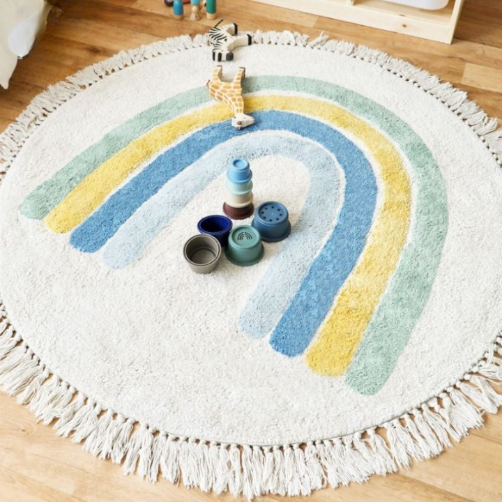 Mjuk blå regnbågsfärgad sovrumsmatta för flickor med fransar