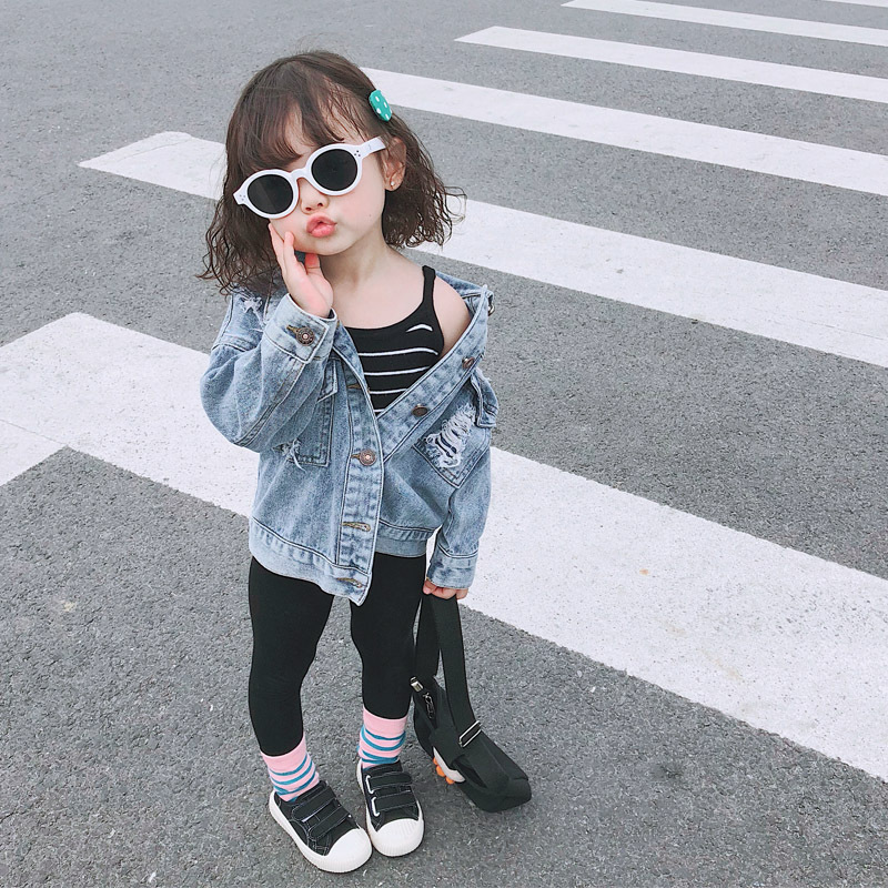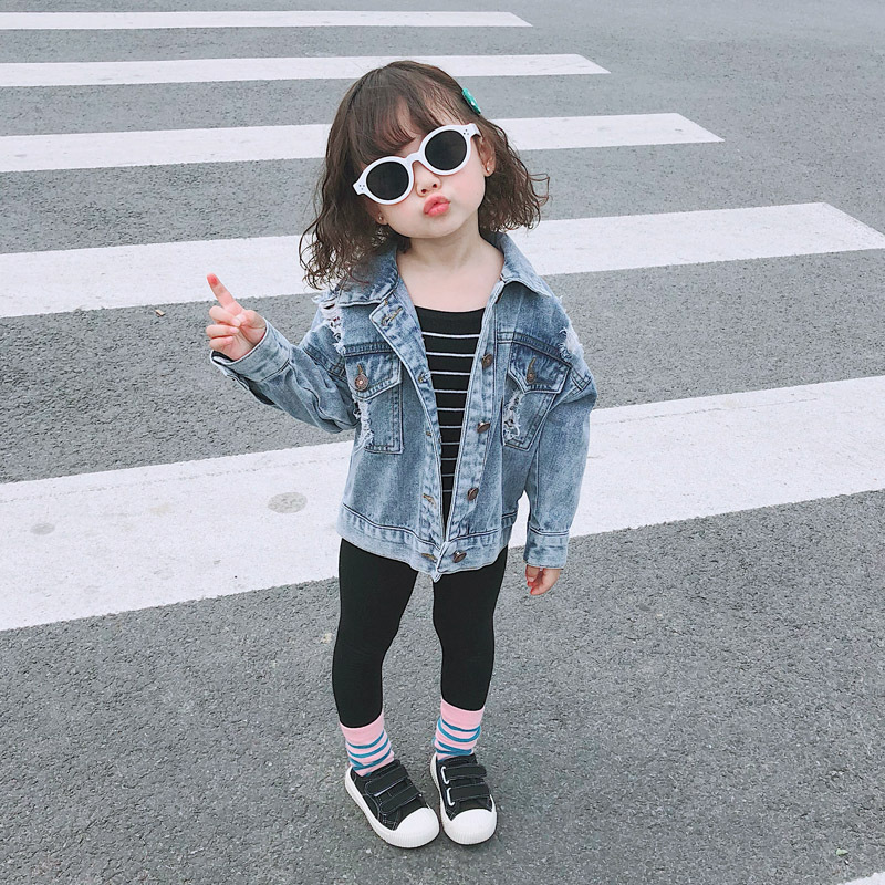 Liten flickas trasiga blå jeansjacka
