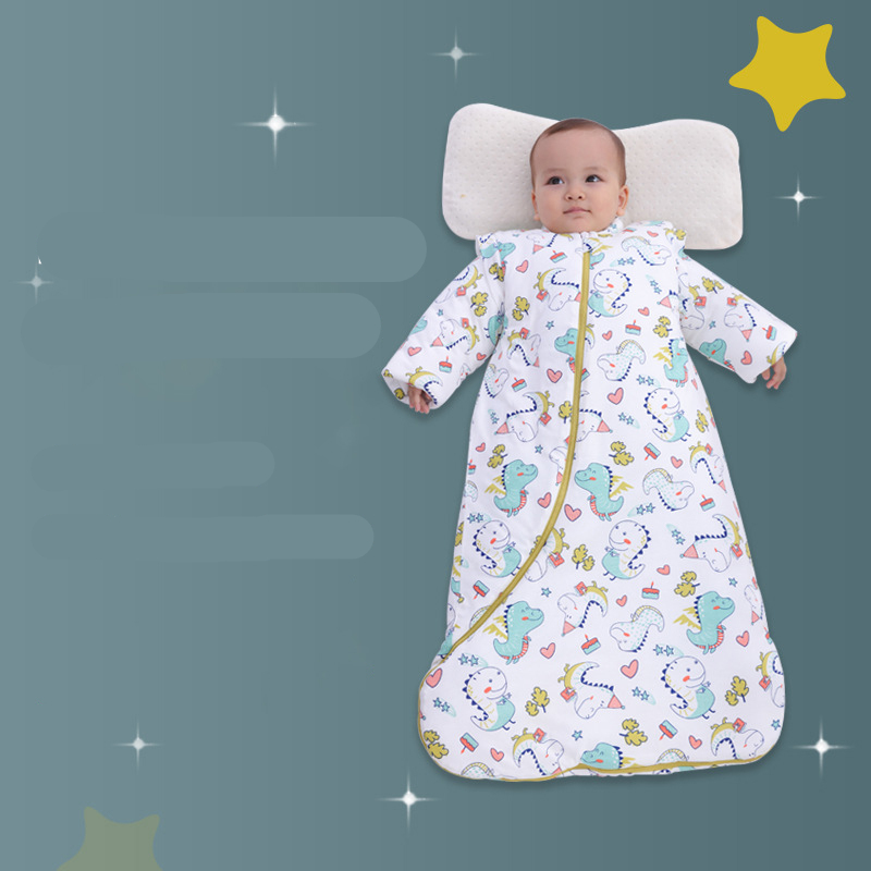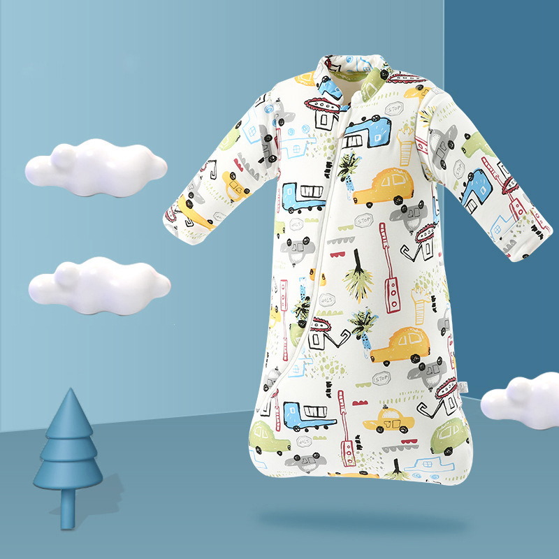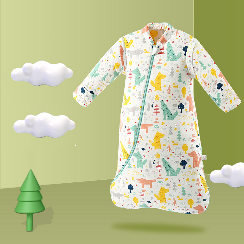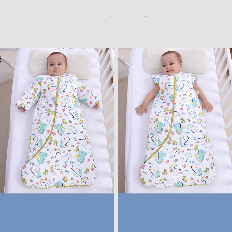 Sovsäck i bomull med avtagbara ärmar är ett mångsidigt plagg. Den är tillverkad av bomull, så den är skonsam mot huden. Du kan enkelt justera ditt barns temperatur genom att lägga till eller ta bort ärmarna efter behov. De tryckta mönstren gör varje modell unik och rolig.