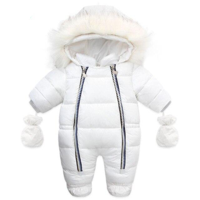 Vit långärmad jumpsuit med vantar och huva i fuskpäls
