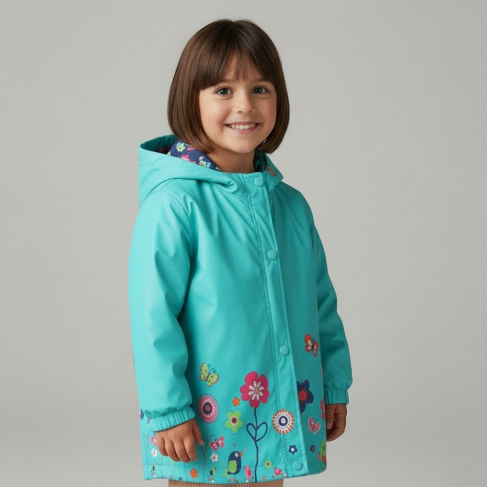 Lång regnjacka med utsvängd huva för flickor