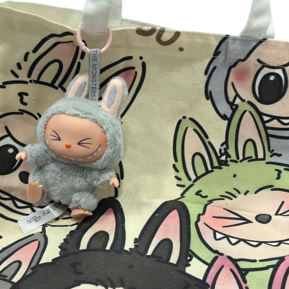 beige totebag med färgglada Labubu-tryck, mot vit bakgrund