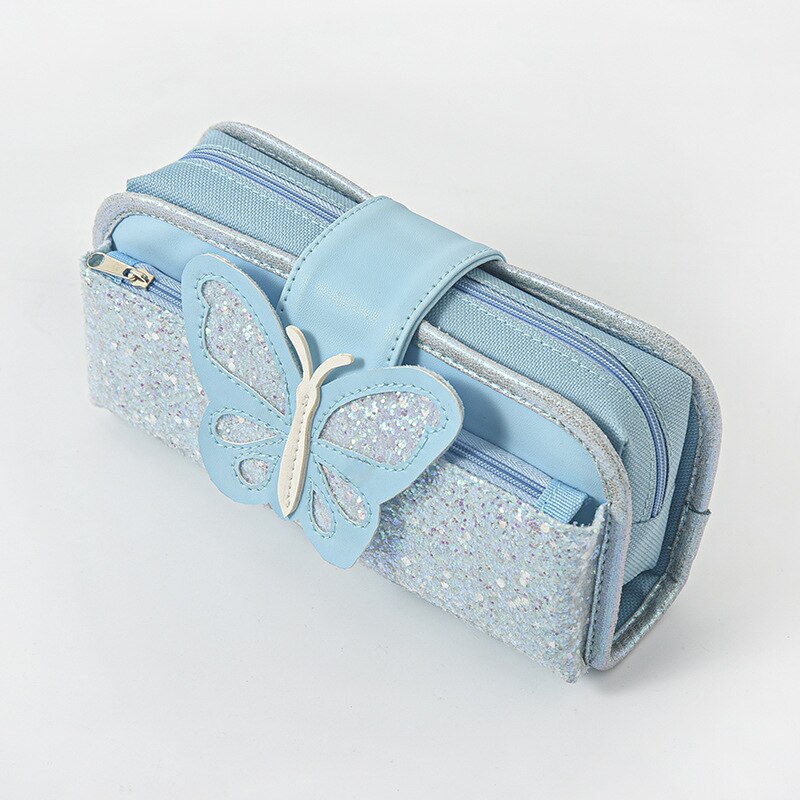 Detta fjärilspennfodral för flickor har en otrolig stil! Det är utsmyckat med paljetter och ett fjärilsmotiv som gör det till den sötaste väskan någonsin! Denna lilla väska har allt ditt barn kan önska sig, tack vare dess söta stil. Det är en oumbärlig accessoar för skolstarten!