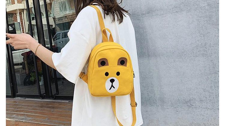 En gul ryggsäck med ett sött nallebjörnsansikte för flickor. Djurets ansikte är vitt och brunt. Den har ett handtag på ovansidan och två axelremmar på baksidan.