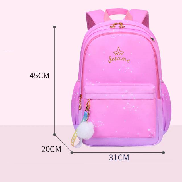 Ryggsäcken för prinsessor är tillverkad av slitstarka, tåliga material och har flera rymliga fack. Ett stort huvudfack som rymmer böcker, anteckningsböcker och andra viktiga skolmaterial är försett med en kraftig dragkedja för att förhindra att saker tappas bort. De justerbara axelremmarna är vadderade för optimal komfort när du bär ryggsäcken.