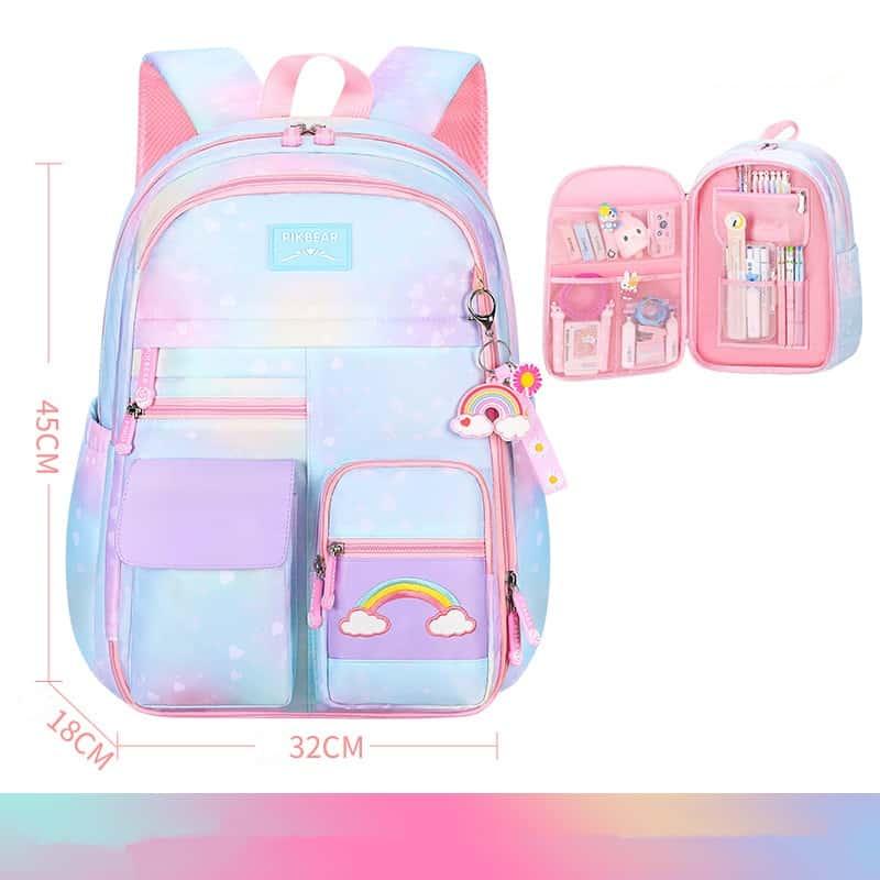 Ortopedisk regnbågsfärgad skolväska för liten flicka med telefon och färgpennor