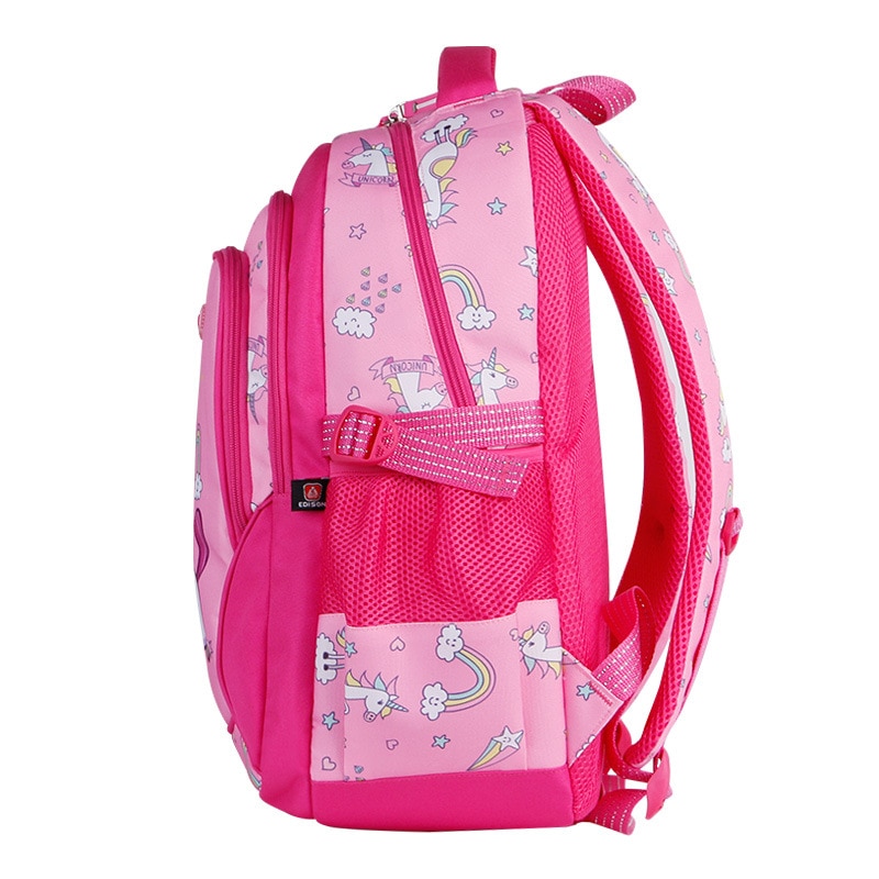 Ryggsäckens mjuka, feminina rosa färg förstärks av söta, färgglada enhörningsmotiv. Varje detalj är noggrant genomtänkt för att fånga små flickors fantasi, med dansande enhörningar, glittrande regnbågar och blinkande stjärnor.